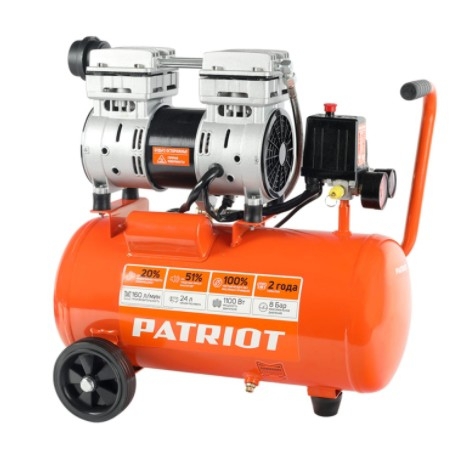 182454 PATRIOT WO 24-160 Компрессор [525306375] {Безмасляный; Мощн. 1,1 кВт; Напр. 230В Об. двиг.: 2850 об/мин; Производительность: 160 л/мин; Объем ресивера: 24 л; Давление: 8 бар}