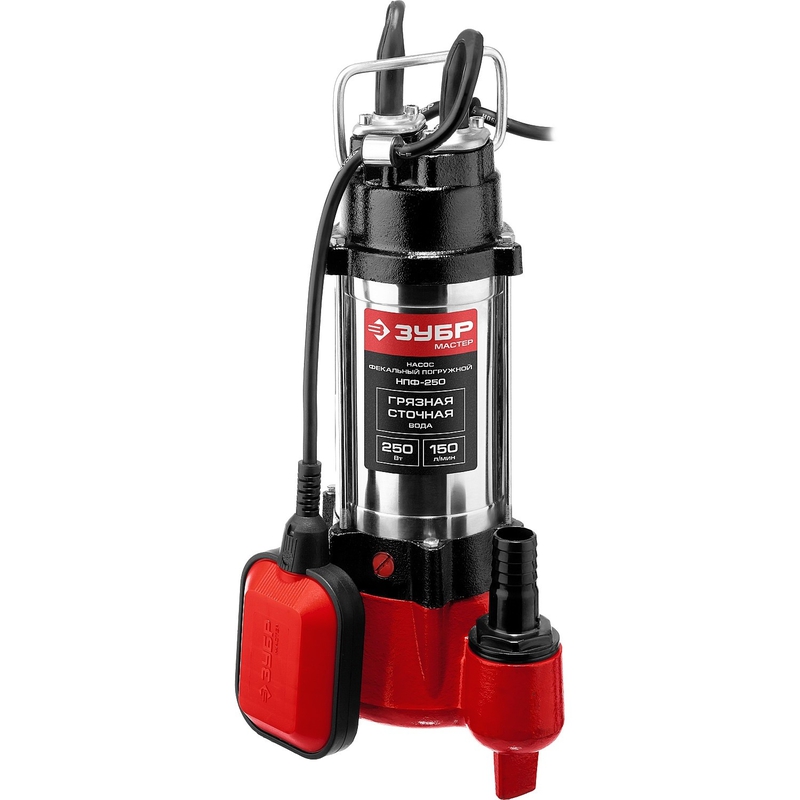 570662 ЗУБР [НПФ-250] Насос фекальный погружной { 250 Вт, пропускная способность 150 л/мин, напор 7,5 м, чугунный корпус, с поплавком }