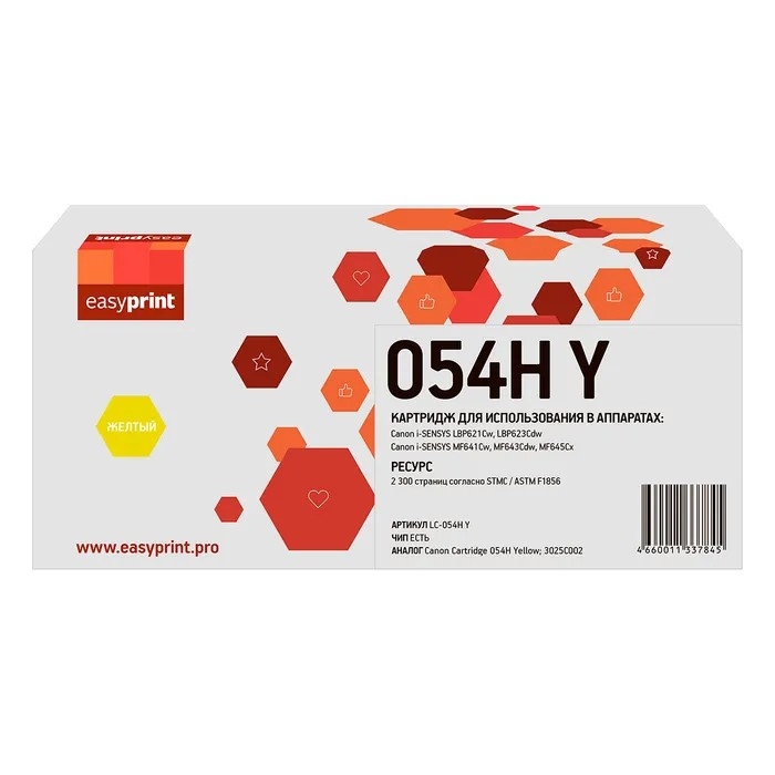 847484 Easyprint Cartridge 054HY Картридж LC-054H Y для Canon i-Sensys LBP621Cw/LBP623Cdw/MF641Cw/MF643Cdw/MF645Cx (2300 стр.) желтый, с чипом