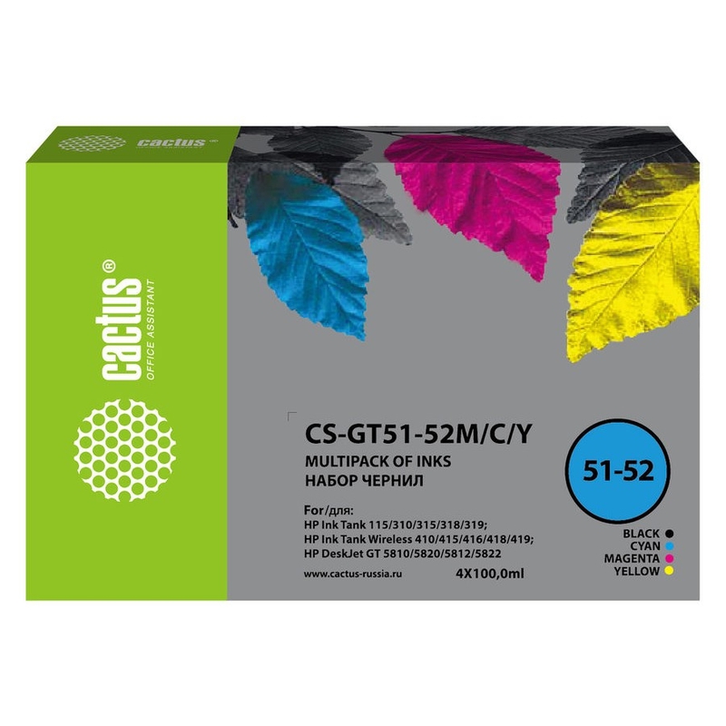 074254 Чернила Cactus CS-GT51-52M/C/Y голубой/пурпурный/желтый/черный набор 4x100 мл для DeskJet GT 5810/5820/5812/5822