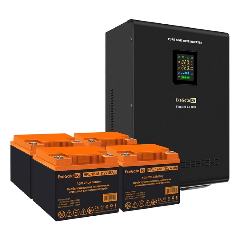 852470 Exegate EX296660RUS Комплект ИБП EX296004RUS + батарея 45Ач EX285666RUS 4шт (инвертор, синус, для котла, настенный) FineSine SX-5000.LCD.AVR.2SH.T <5000VA/3500W, чистая синусоида, цветной LCD-дисплей,