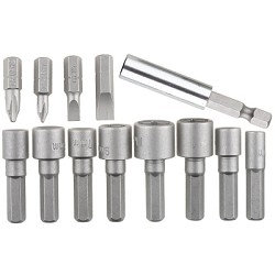 удлинитель-адаптер с магнитным держателем для бит; 8 торцевых головок с шестигранным хвостовиком; 4 биты длиной 25 мм
