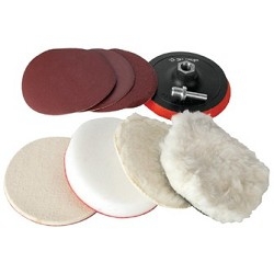 Переходник на дрель, Тарелка опорная , 3 шлифовальных круга, Насадки : фетровая, Паралоновая, Ис. шерсть, Нат. шерсть